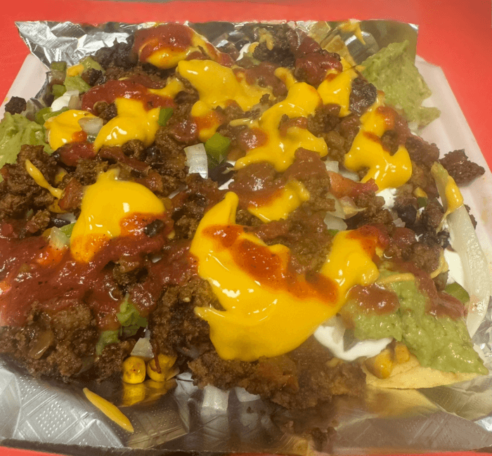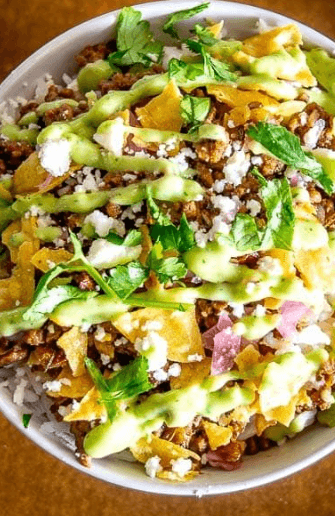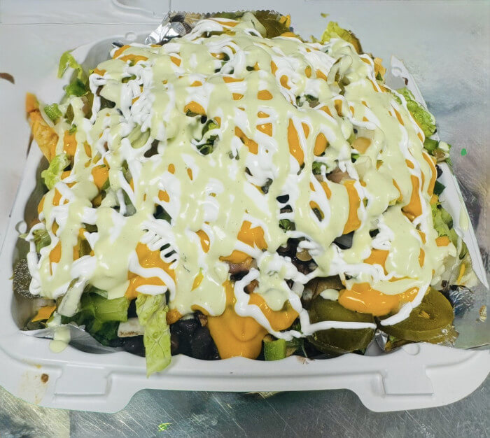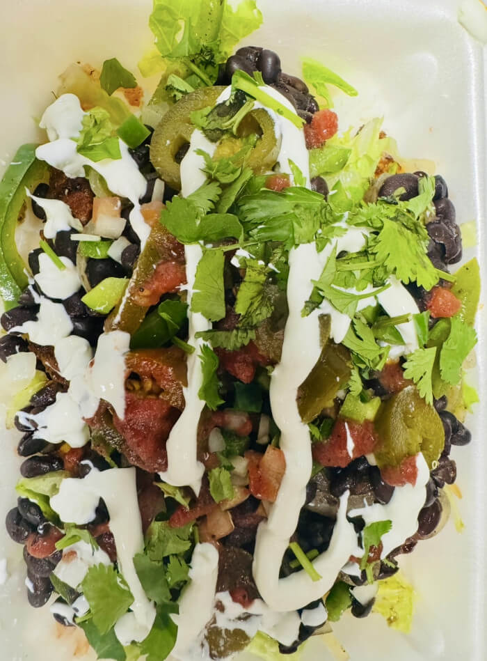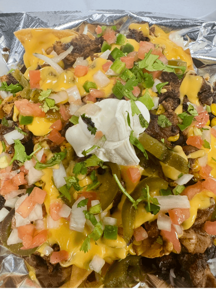 Crispy tortilla chips topped with queso, black beans, fresh pico de gallo, cool sour cream, zesty jalapeños, roasted corn, your choice of rice, fresh cilantro, and your choice of toppings and sauce.