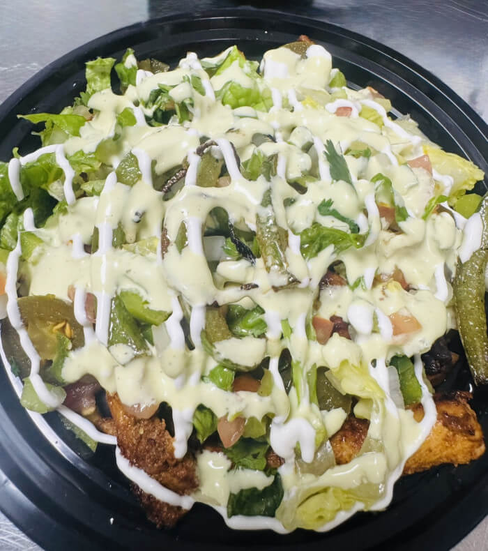 Crispy tortilla chips topped with queso, black beans,fresh pico de gallo, cool sour cream, zesty jalapeños, roasted corn, your choice of rice, fresh cilantro, and your choice of toppings and sauce.