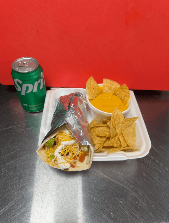 cilantro-lime rice or Spanish rice on a toasted 12-inch flour tortilla stuffed with melted cheese, crisp lettuce, fresh pico de gallo, cool sour cream,corn, black beans, jalapenos,and grilled onions. Served with your choice of salsa or sauce, queso & chips and a chocolate chip cookie.